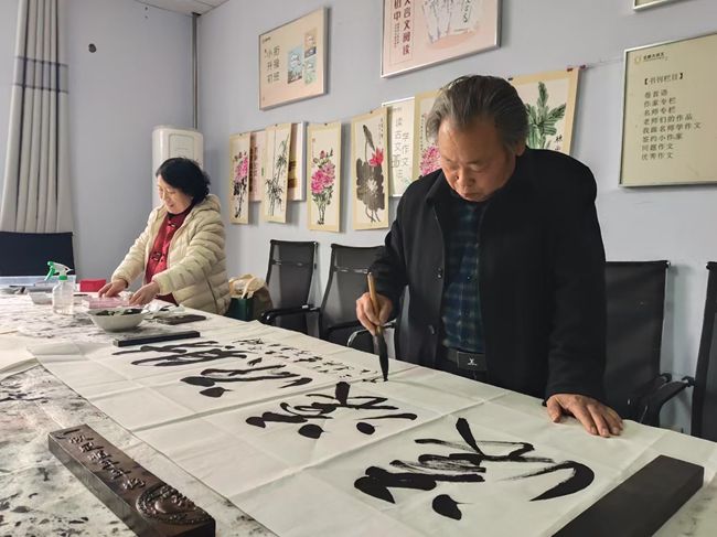 东风送暖花千树,骏马扬蹄路八方。活动现场,书法家司国法笔走龙蛇,泼墨成章,一幅幅“一马当先”、“马到成功”墨宝及充满喜庆和祝福的春联脱颖而出,画家刘丽、傅贞吉点夋勾勒、情寄丹青,创作了一批牡丹、葡萄、竹子等色彩明丽、臻善臻美的佳作,将分别赠送给退伍老兵革命功臣,传承沂蒙拥军爱国精神。