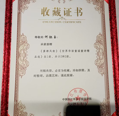 注:本次何怀玉会长捐赠浙江传媒学院两本诗集,余在《蓼都风韵》书中担任副主编,在《世界华语童谣童诗精品选》书中担任主编。